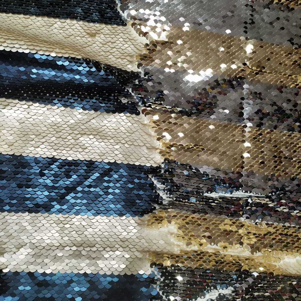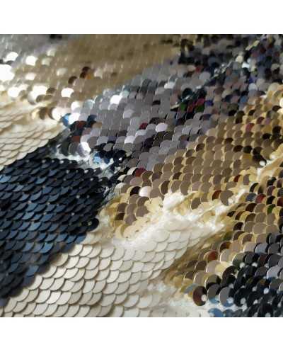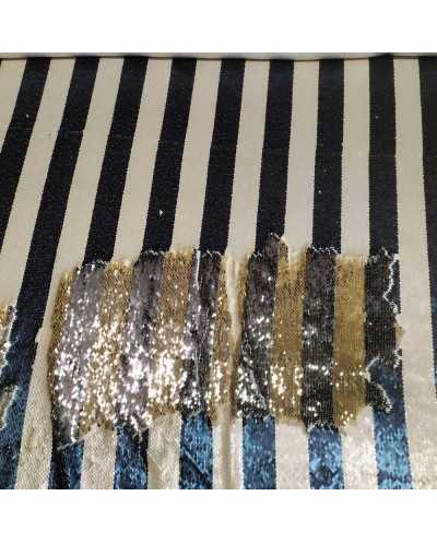 Tessuto jersey paillettes scrivente rigato bicolore panna e blu/oro e argento