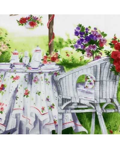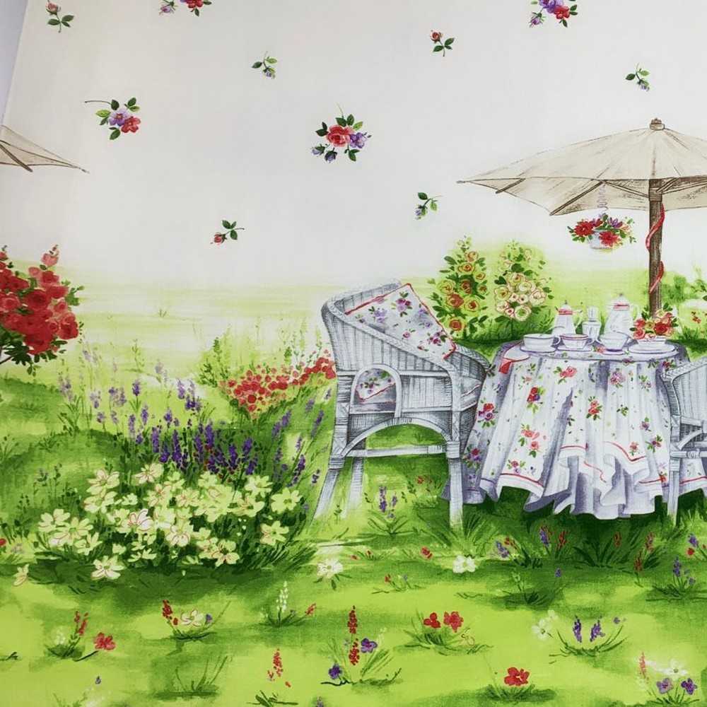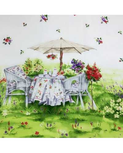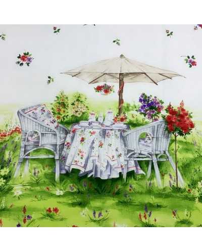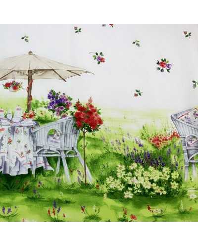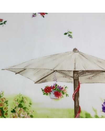 Tessuto cotone tovagliato stampato disegno balzato giardino con ombrellone e fiori