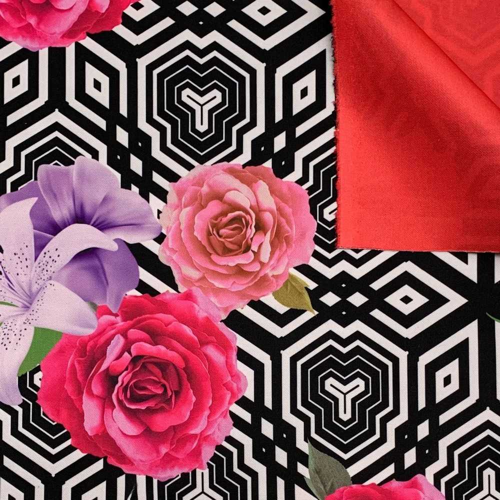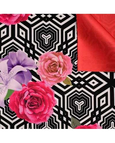 Tessuto jersey scuba stampato elastico disegno fiore fondo geometrico bianco e nero, retro rosso