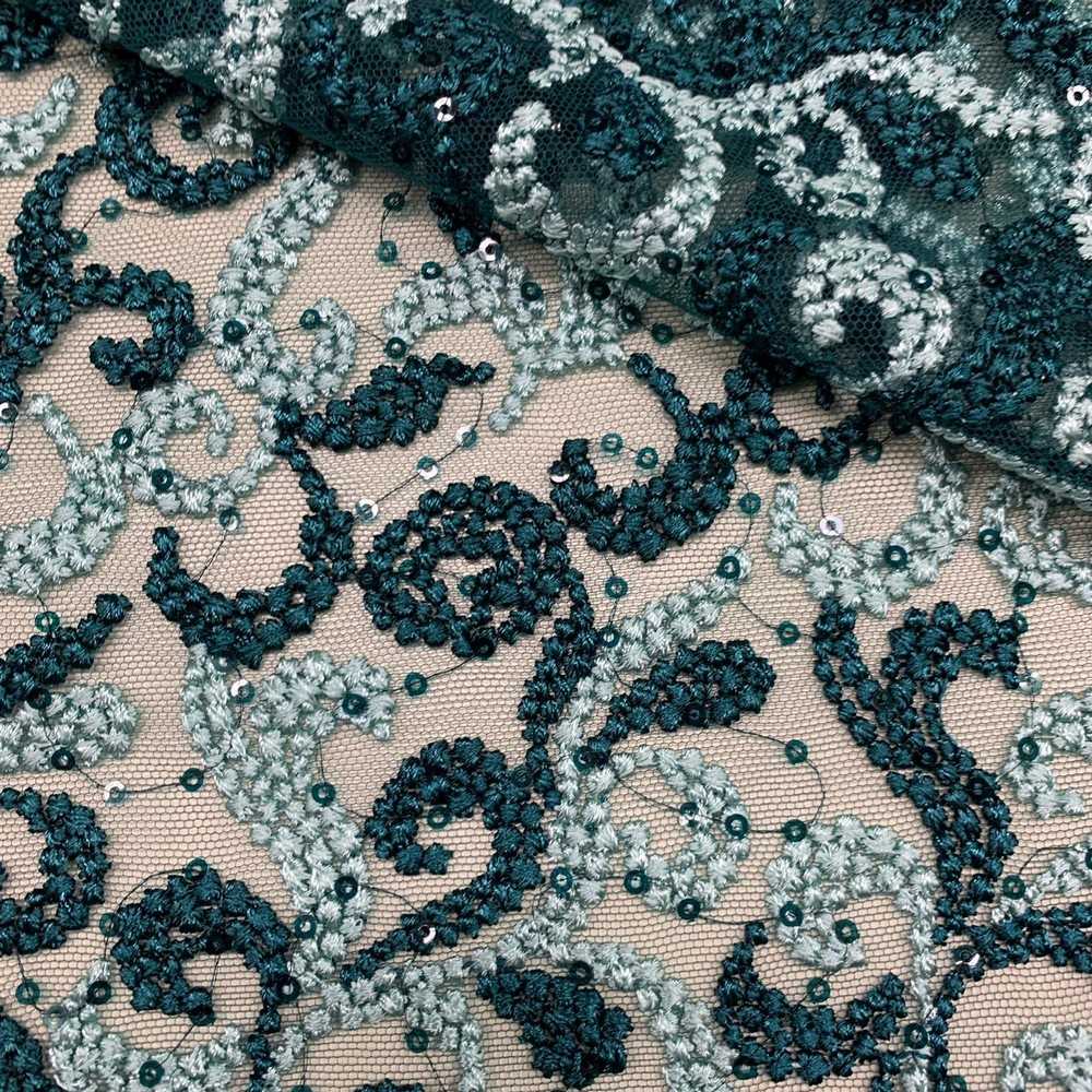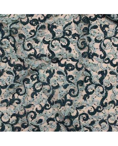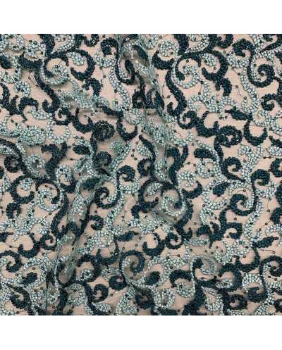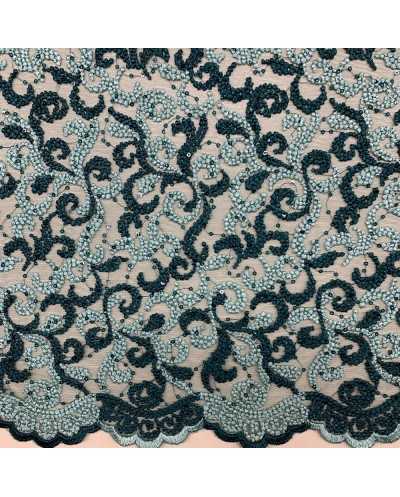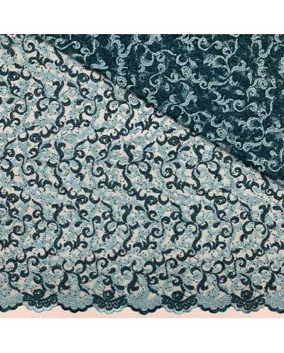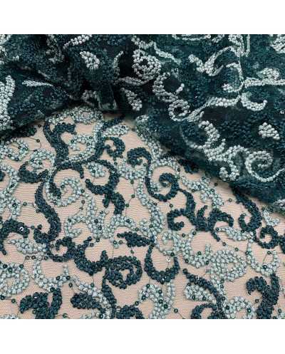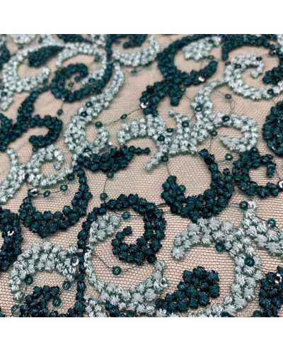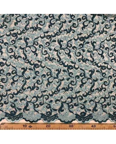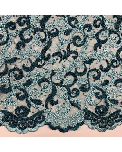 Tessuto tulle ricamato bi-colore verde acqua e petrolio con doppio smerlo