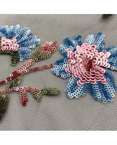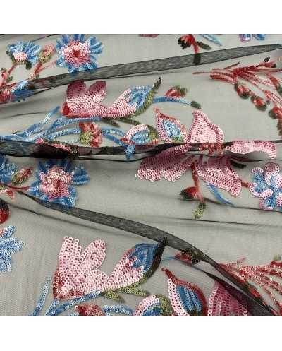 Tessuto Tulle Ricamato Nero Fiore Rosa 50 Cm