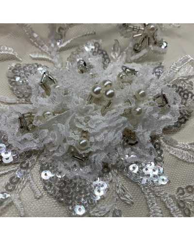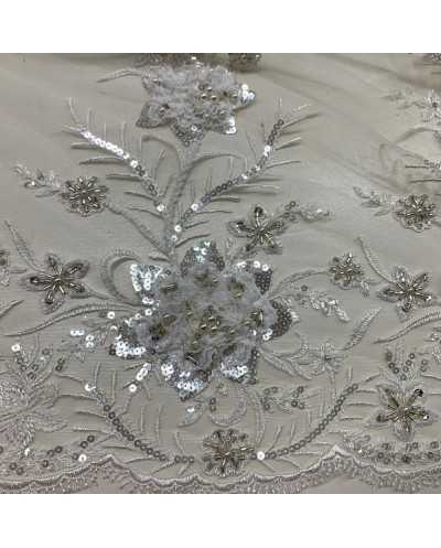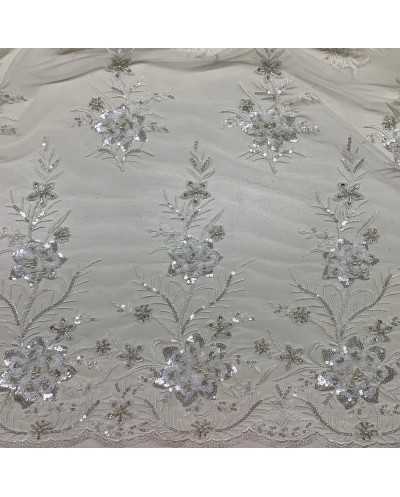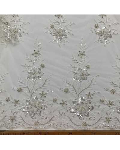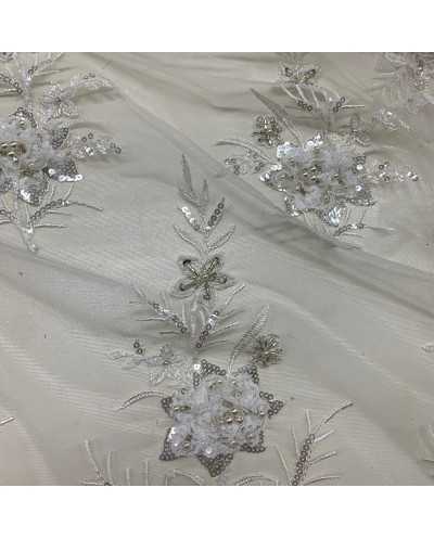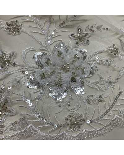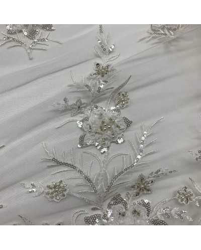 Tessuto Tulle Bianco Ricamato Fiori 3D Argento 50 Cm