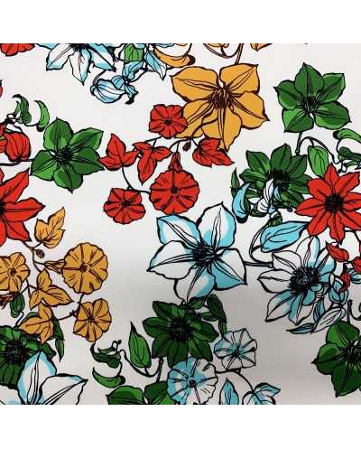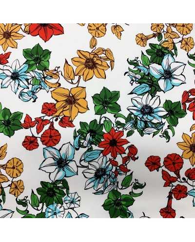 Tessuto cotone gabardine stampato disegno fiori fondo bianco