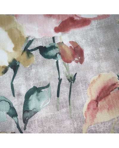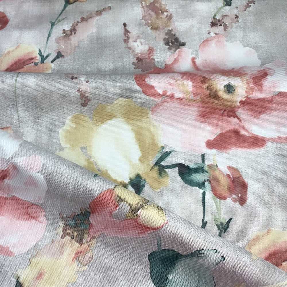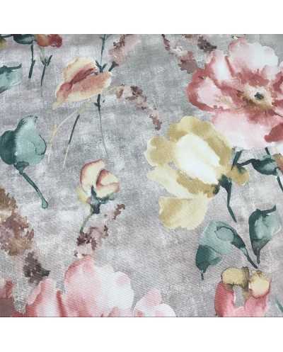 Tessuto panama stampato fiore dipinto rosa giallo fondo grigio