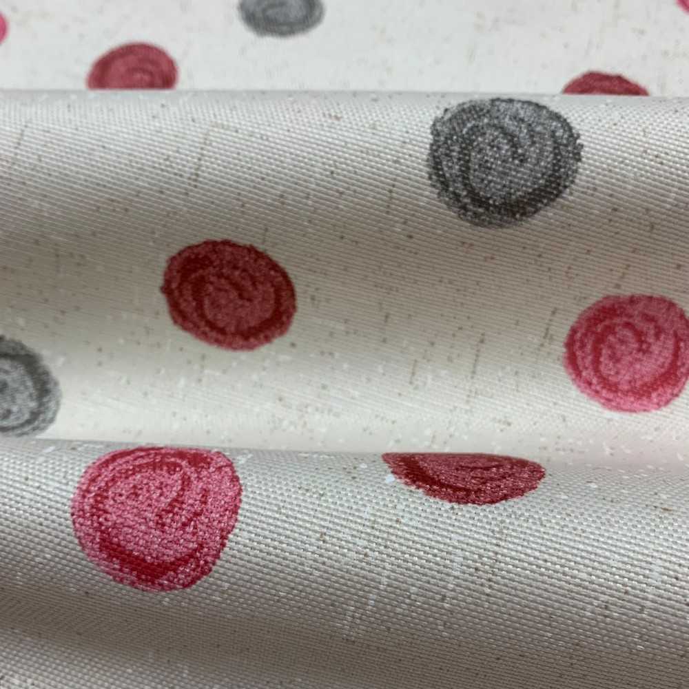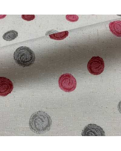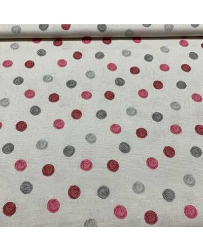 Tessuto panama tappezzeria base beige chiaro melange pois colorati rosso, bordeaux e grigio