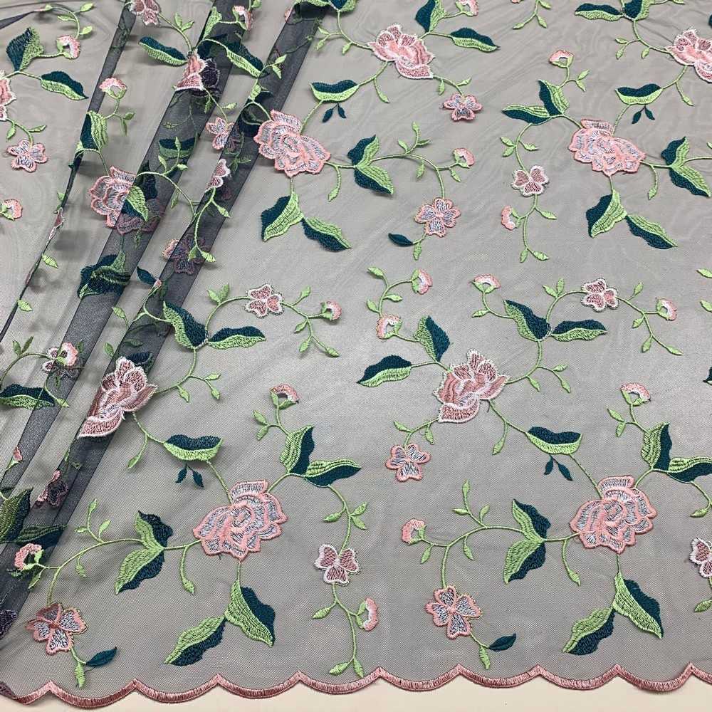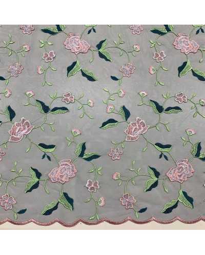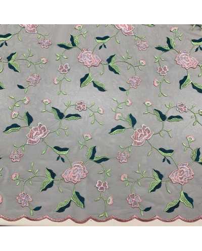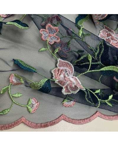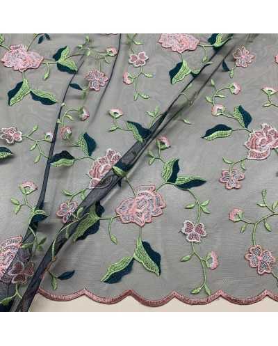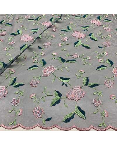 Tessuto Tulle Ricamato Blu Fiori Rosa 50 Cm