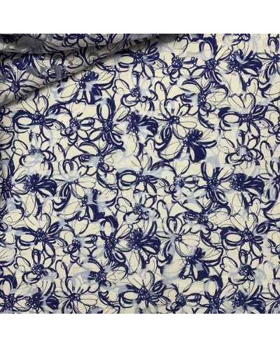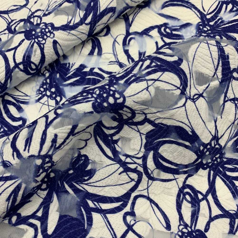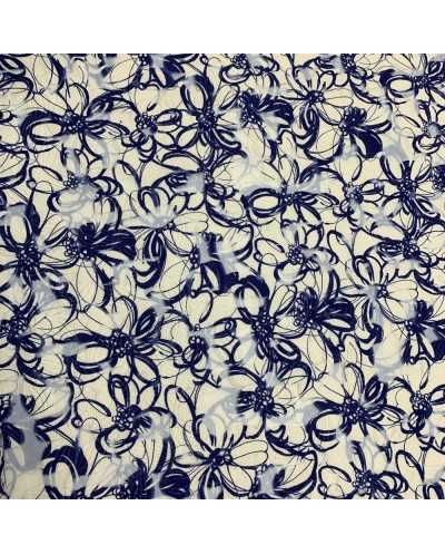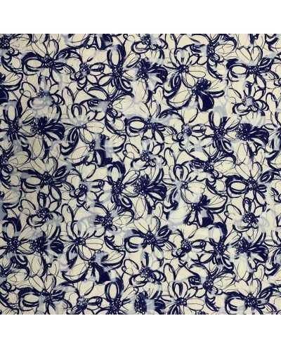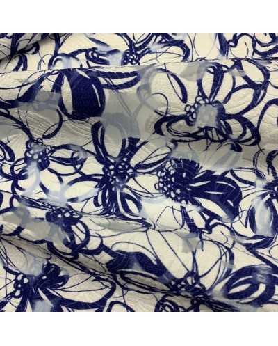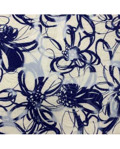 Tessuto chiffon stampato lavorazione devorè disegno fiori bianco e blu