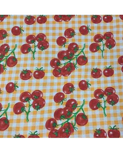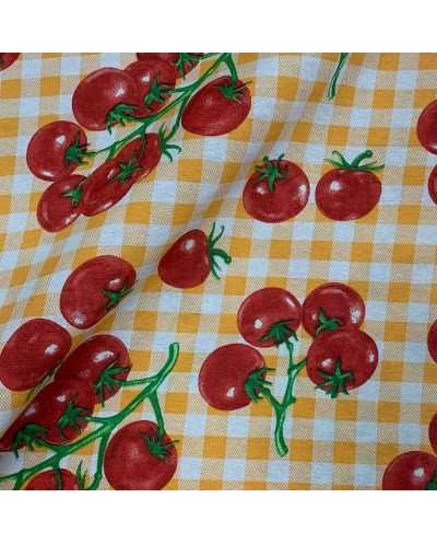 Tessuto tappezzeria cotone stampato base quadretti bianco arancio con pomodori