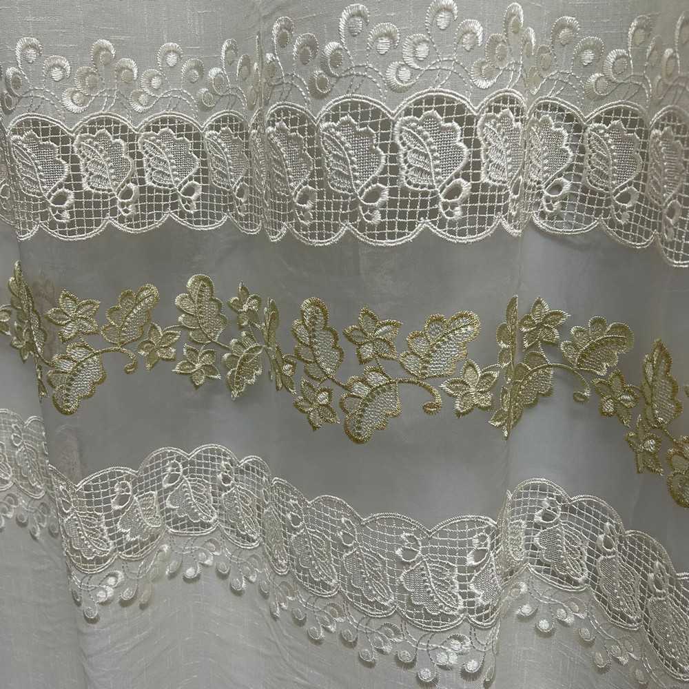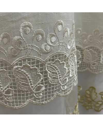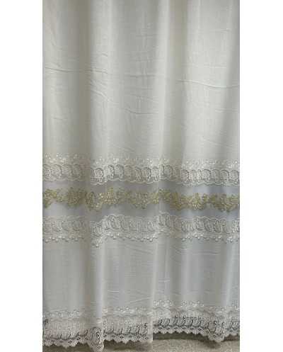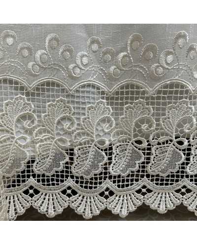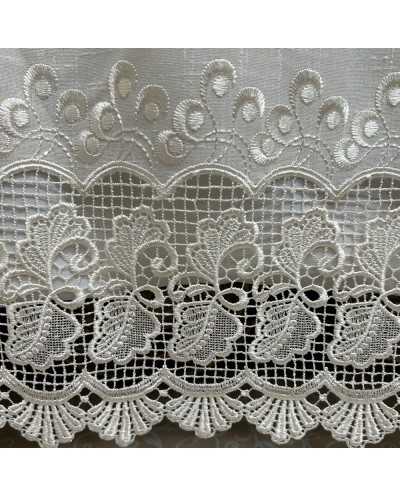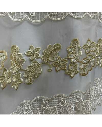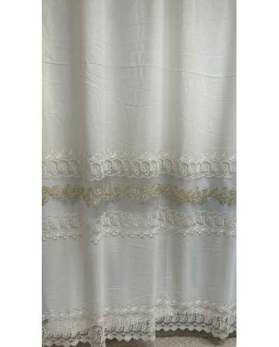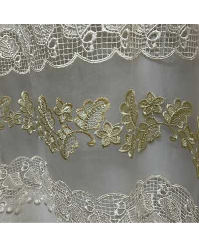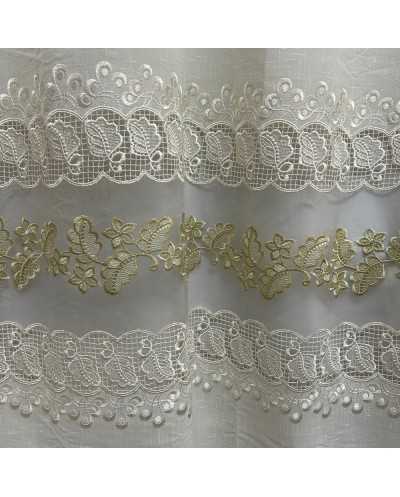 Tessuto tendaggio base fiammetta ricamata con balze di macramè e di organza