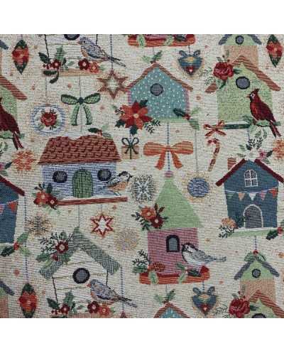 Tessuto natalizio gobeline tinto in filo con uccellini e casette