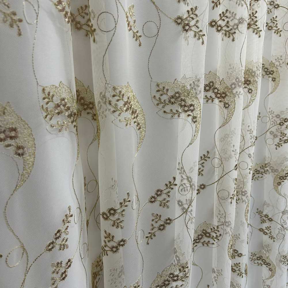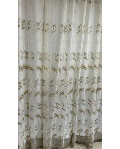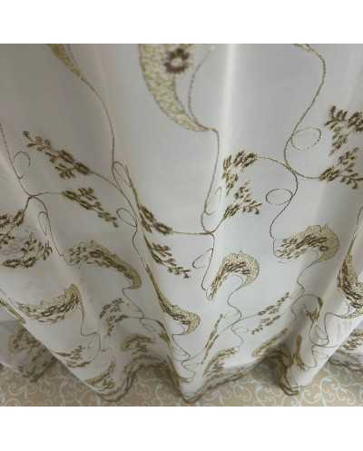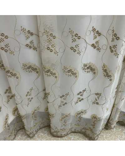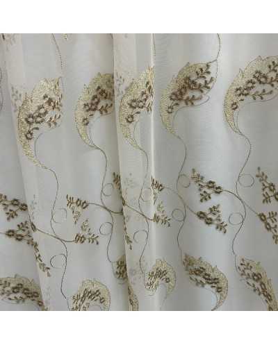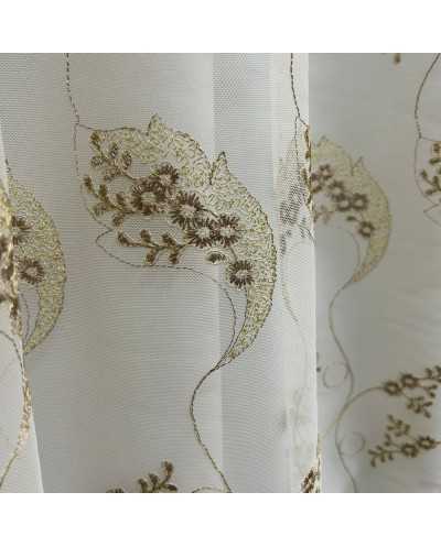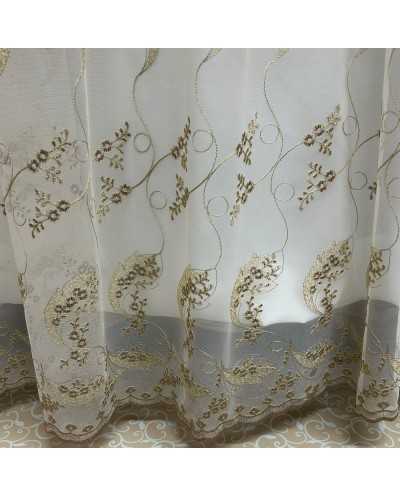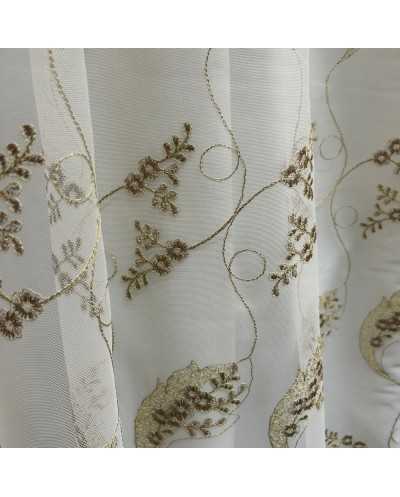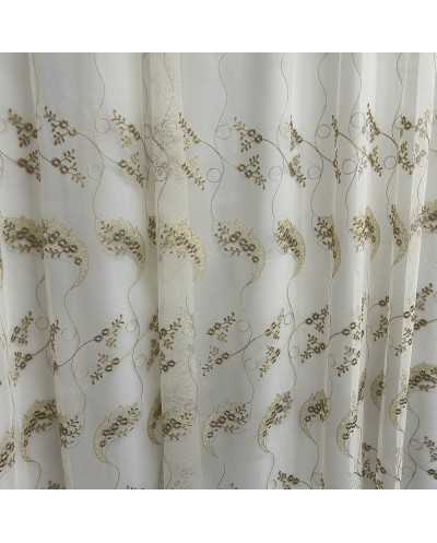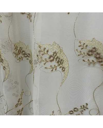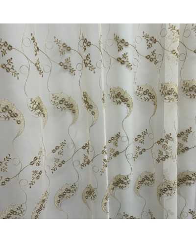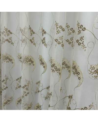 Tessuto tenda tulle fondo panna ricamato fiori marrone