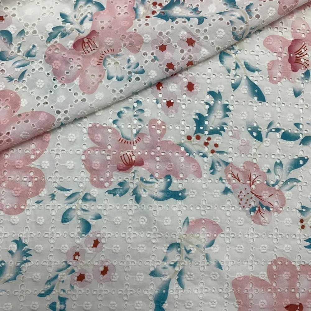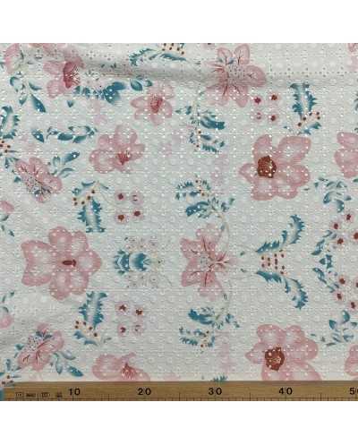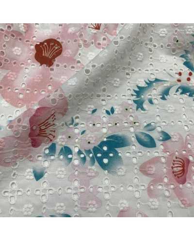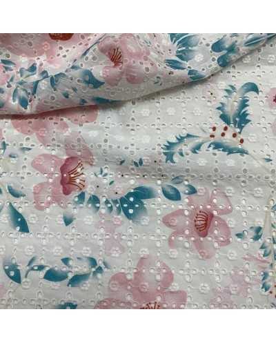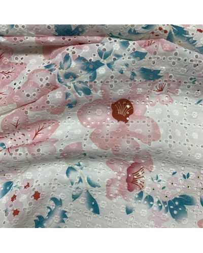 Tessuto mussola ricamo sangallo stampato fiori celeste