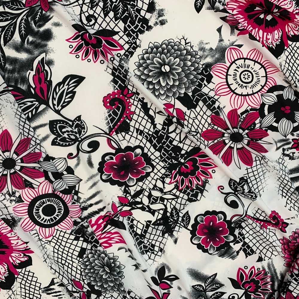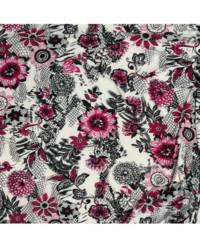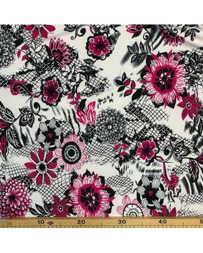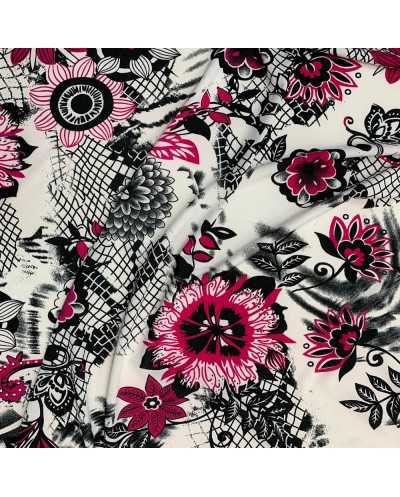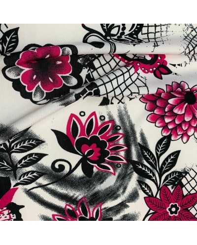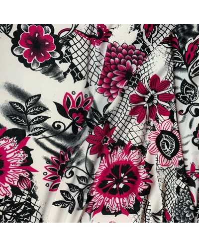 Tessuto jersey elastico stampato base bianco e fiori fucsia