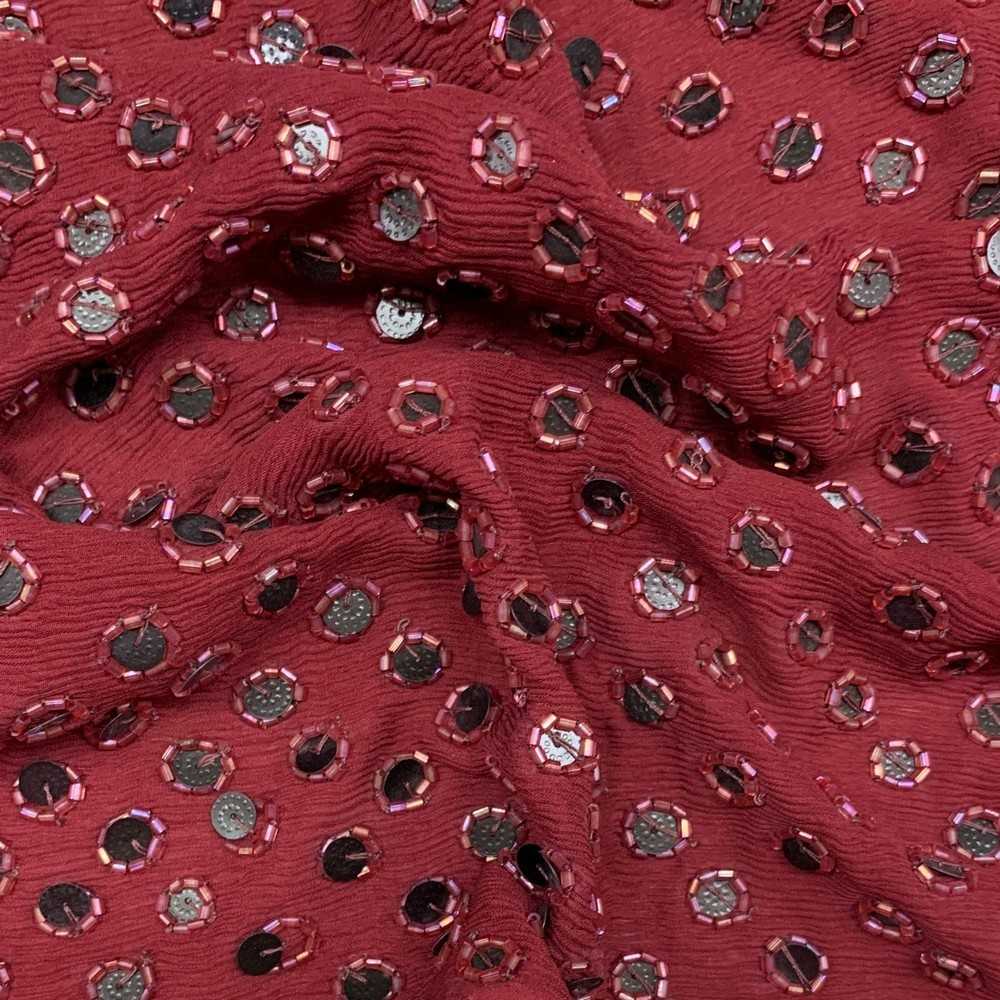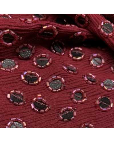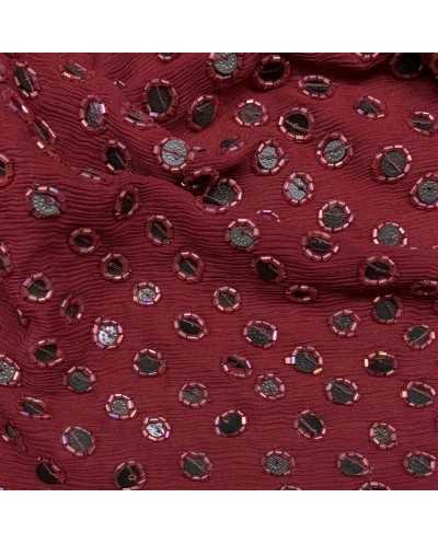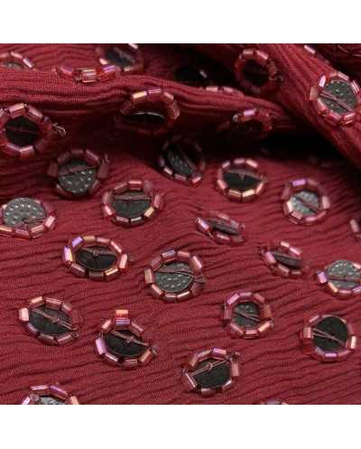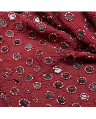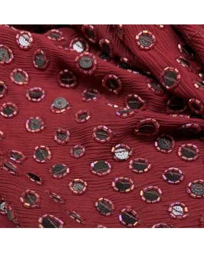 Tessuto georgette in pura seta ricamata con tubicini e paillettes bordeaux