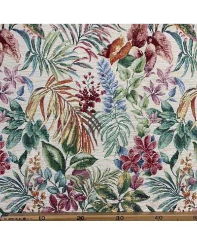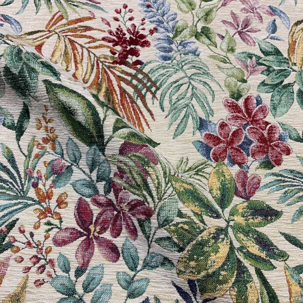 Tessuto tappezzeria ciniglia pesante jacquard disegno Tropicale fondo panna