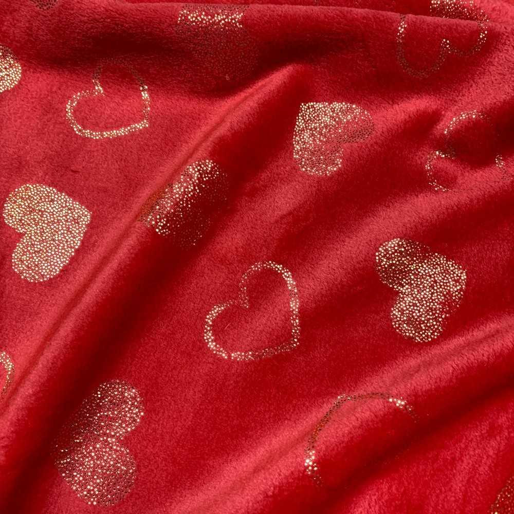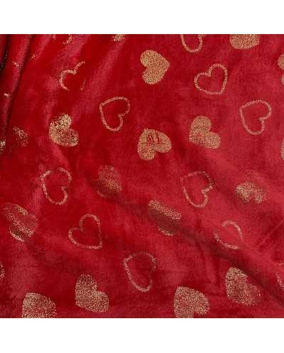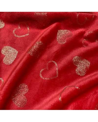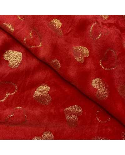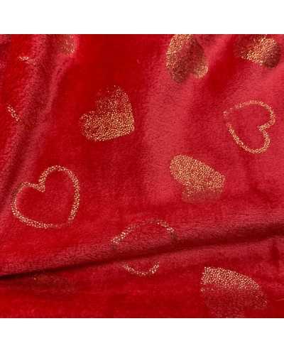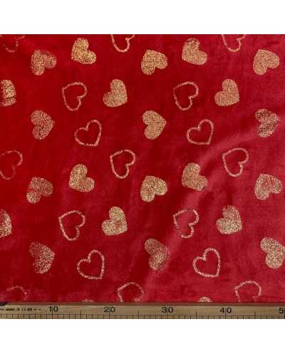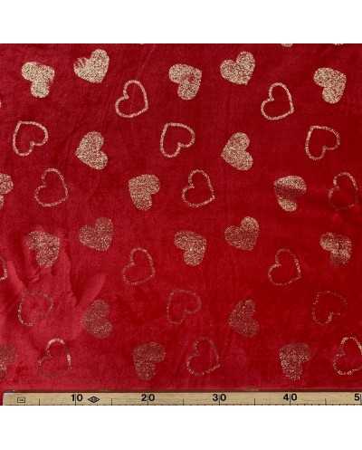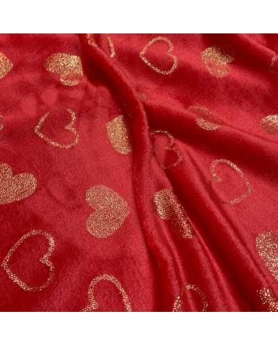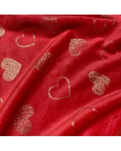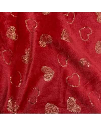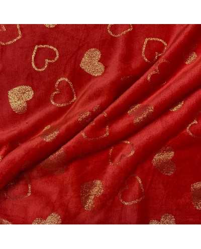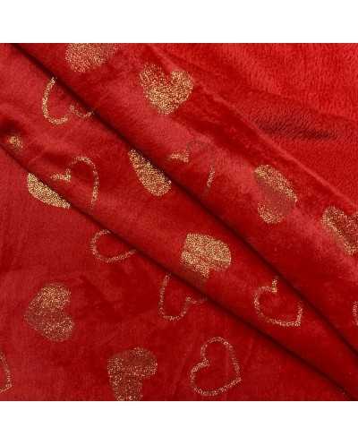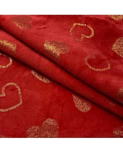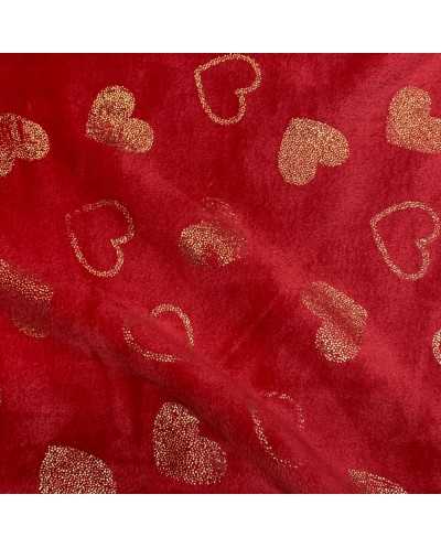 Tessuto pile cinigliato morbidoso rosso stampato cuori lamè oro