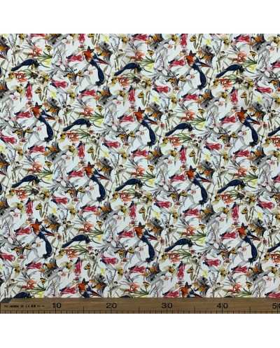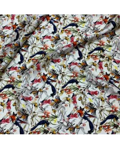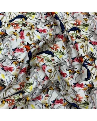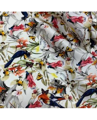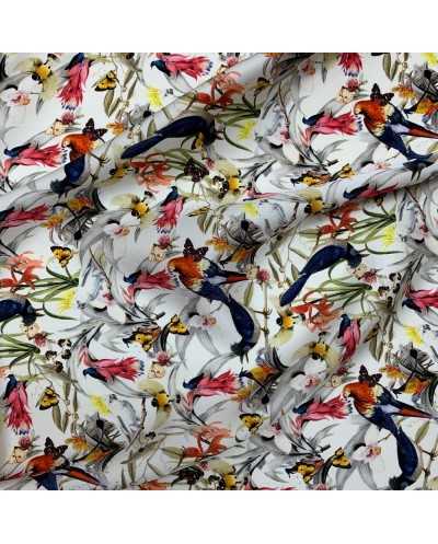 Tessuto pura seta stampata disegno Parrots color bianco