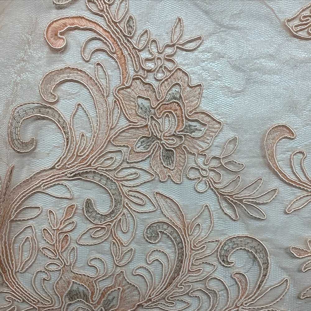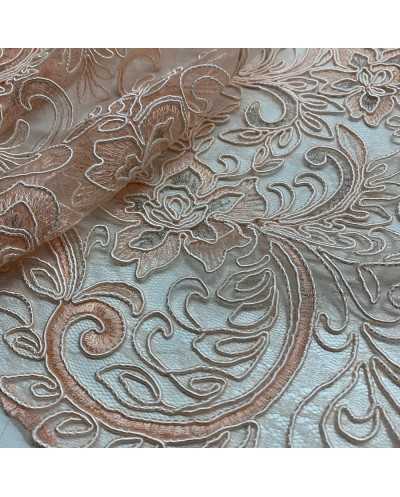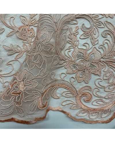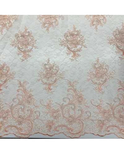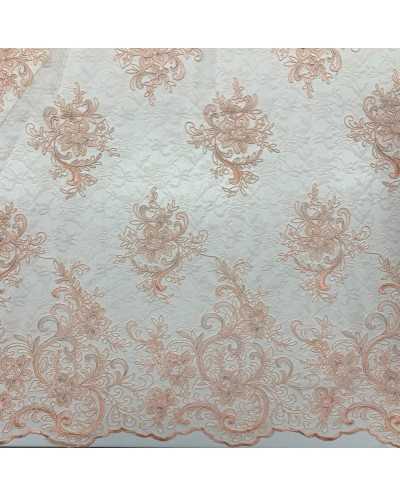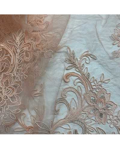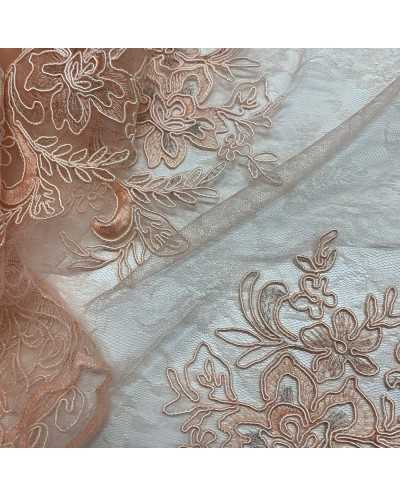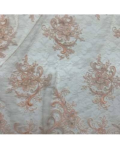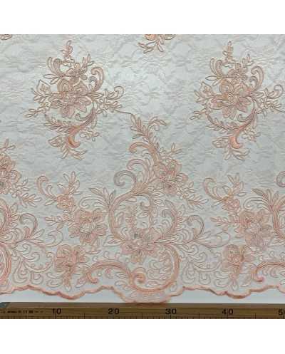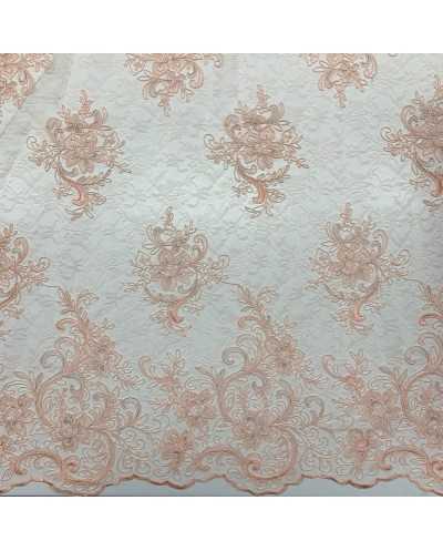 Tessuto tulle ricamato doppio smerlo fiori color rosa pesco