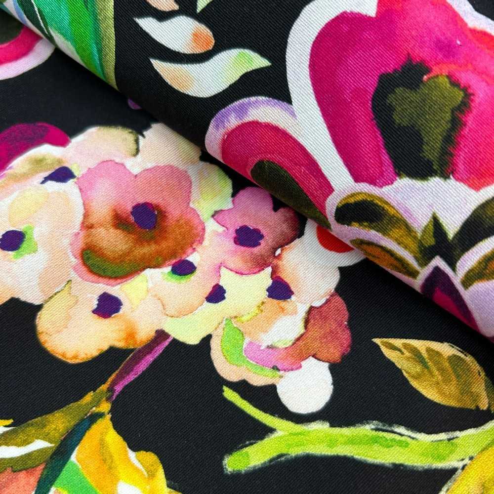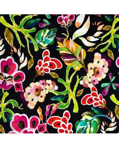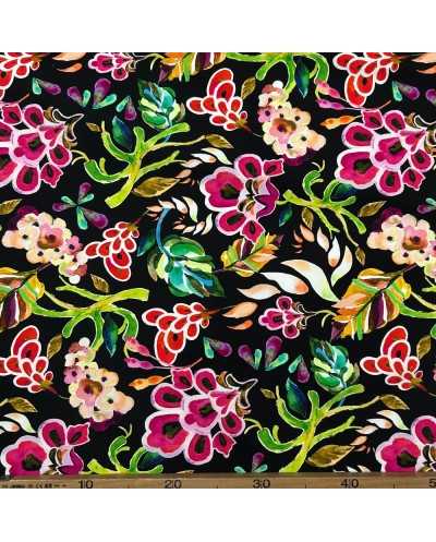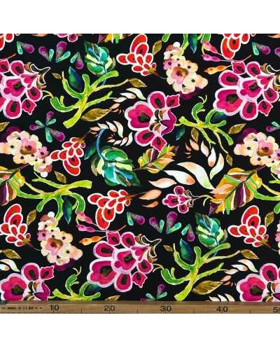 Tessuto Gabardine Elastico Nero Fiori Tropicali 50 Cm