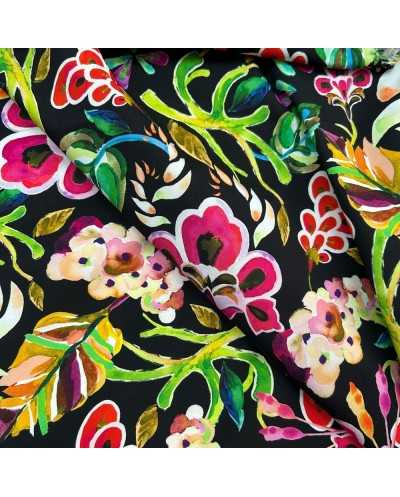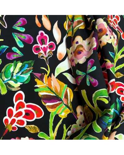 Tessuto gabardine elastico stampato fondo nero disegno fiori tropicali fucsia